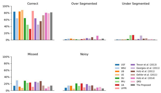 We have compared the proposed approach with several typical ones on SegComp ABW test set with an 80% area overlap tolerance, including USF [22], WSU [22], UB [22], UE [22], OU [22], PPU [22], UA [22], UFPR [22], Trevor et al. [23], Georgiev et al. [24], Holz et al. [25], Oehler et al. [26], Holz et al. [27], and DPD [10]. In this part, 1800 seeds are put in the image with grid local seeding strategy, and the distance threshold is set to 0.025, which achieved the best performance in ablation study on the train set.