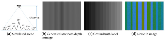 To evaluate the robustness of the proposed approach, a set of sawtooth depth images are generated with a resolution . As shown in Figure 6a, it is a saw tooth structure with different heights. Three images are generated with distance at 1, 2, and 4 m. To simulate images captured from a consumer RGBD camera, both axial and lateral noise are added into images, according to a specific noise model [28].