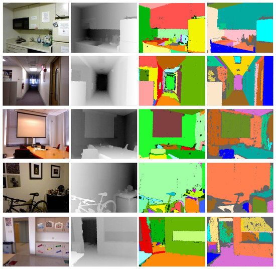 - Silberman, N.; Hoiem, D.; Kohli, P.; Fergus, R. Indoor Segmentation and Support Inference from RGBD Images. In Computer Vision–ECCV 2012; Fitzgibbon, A., Lazebnik, S., Perona, P., Sato, Y., Schmid, C., Eds.; Springer: Berlin/Heidelberg, Germany, 2012; pp. 746–760. [Google Scholar]