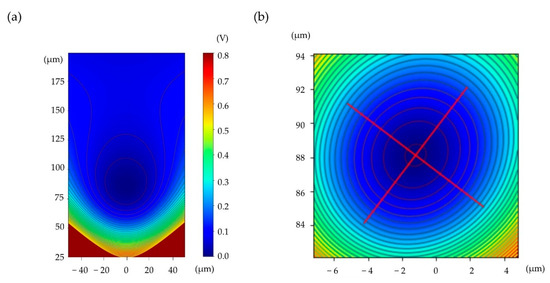 where is the charge of the ion, is the mass of the ion, and is the radio frequency of the voltage applied to the RF electrodes. The static potential can be calculated by linear combination of the other electric fields generated by all DC electrodes, and the total potential can be obtained by adding the pseudopotential () and the static potential. Figure 3a shows a contour plot of total potential generated by voltages applied to the electrodes of the surface ion trap, with layout and DC voltages, as shown in Figure 2b. For the RF voltage, and are assumed. Figure 3b is a magnified view of the total potential around the minimum point with the two principal axes.