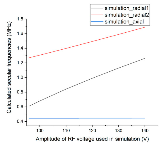 Expected secular frequencies of a 174Yb+ ion trapped by a total potential created by the RF voltage applied according to the numerical simulation. All the DC voltages remain constant as shown in Figure 2b.