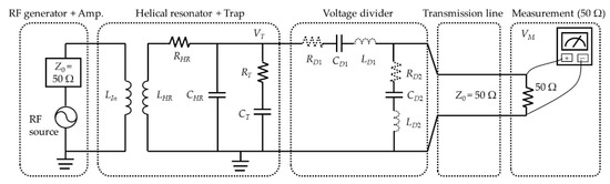 An ion trap is an essential physical platform in quantum information processing including quantum computing [1,2,3,4,5] and quantum networks [6], attributed to its high-fidelity quantum gates [7,8] and long coherence time [9]. Ions are confined by potentials created using electric fields, which allow fine control of various parameters of the potential [10,11,12,13,14]. To create sufficient potential to trap ions, a Paul trap requires strong oscillating electric fields that are generated by high voltages applied to the radio frequency (RF) electrode of the trap [15]. Generally, resonators such as RLC resonant circuits [16] or helical resonators [17] are used as RF voltage amplifiers to generate the high voltages necessary for the ion trap. However, the voltage gain of the RF resonator is extremely sensitive to resistance changes and load or resonator capacitance. Therefore, only the order of magnitude of voltage gain can be inferred to be proportional to the square root of the quality factor () based on the law of conservation of energy [18,19]: