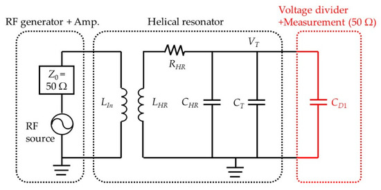 The main role of the helical resonator in an ion trap setup is to amplify a small input RF voltage to the large amplitude required to trap an ion. Unfortunately, the voltage gain of the helical resonator decreases as the load capacitance connected to its output increases. The largest contribution to the load of the helical resonator generally comes from the ion trap by itself. Because the voltage divider will be connected to the helical resonator output in parallel with the ion trap, the contribution of the equivalent capacitance posed by the voltage divider to the total load capacitance should be very small compared with that of the trap, to avoid significant voltage gain reduction [16]. Figure 5 shows a simplified circuit model for our experimental setup with an RF voltage source including an RF amplifier, a helical resonator connected to a trap, a voltage divider, and a measuring instrument [39]. LIn and LHR are the inductance of the input coil and the main coil of the helical resonator, respectively. RHR and RT are the parasitic resistance of the helical resonator and the ion trap, respectively. CHR and CT are the capacitance of the helical resonator and the ion trap, respectively. RD1 and RD2 are the sums of the contact resistance and the equivalent series resistance (ESR) of the capacitors in the voltage divider, and LD1 and LD2 are the equivalent series inductance (ESL) of the corresponding capacitors.