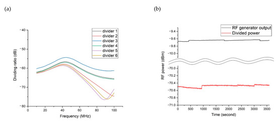 Characterization of voltage divider modules. (a) Measured dividing ratios of six voltage dividers as a function of input frequency (input power = −10 dBm). (b) Measured RF power of an RF generator output and output of voltage divider 1 over 1 h (input signal = 22.2 MHz, −10 dBm). RF generator output and divider power were measured at different times, but they were plotted in the same plot to show the time scale of RF power measurement drift. The standard deviation of the divided power is 0.028 dB.
