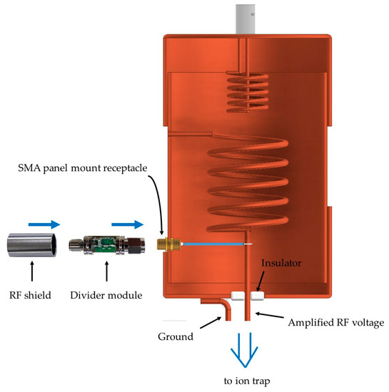 The helical resonator used in our test has a resonant frequency of 22.2 MHz when our trap is connected [17]. Although the voltage dividers developed in this work will have parasitic impedances not properly estimated in our simple model as shown in Figure 7a, the frequency response will not change as long as the requirements discussed in Section 2.3 are satisfied because the relation between the input and output of the modularized voltage divider is characterized after the divider is shielded. To probe the output of the helical resonator, we installed an SMA panel mount receptacle to it, as shown in Figure 8. Although Figure 8 shows the RF shield of the voltage divider module separately to visualize how the divider module is constructed, the RF shield of the module is fixed mechanically to the body of the module before all the characterization is performed.