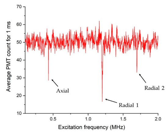 The secular frequency of a trapped ion can be measured by monitoring the amplitude change of the harmonic oscillation with excitation at the resonant frequency. Excitation with some specific frequency can be achieved either by amplitude modulation of the RF voltage applied to the ion trap [40] or by direct application of a small voltage oscillating at the secular frequency to one of the DC electrodes. In this work, we used both methods to cross-check our measurement results. As we scan excitation frequencies, the amplitude of secular motion starts to increase only when the excitation frequency coincides with the secular frequency, and a photomultiplier tube (PMT) can detect a change in the number of photons emitted from the ions [40]. Using this method, the secular frequencies of trapped 174Yb+ ions are measured. Figure 9 shows an example of the number of photons emitted from trapped ions as a function of the excitation frequency. We observed abrupt changes in the amount of photons at three frequencies, which correspond to the axial and radial frequencies of our trapping potential as was discussed in Section 2.2.