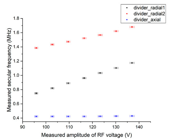 When an unknown constant RF voltage is applied to the ion trap through a helical resonator, secular frequencies can be measured using the method in Section 3.3, and the amplitude of the corresponding RF voltage can be measured using the voltage divider explained in Section 3.2. Figure 10 shows measured secular frequencies as a function of measured RF voltage.