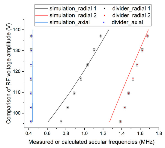 In Figure 11, we compare the RF voltage measured by the voltage divider with the voltage necessary to obtain the same numerical secular frequencies as the measured secular frequencies that was estimated by the numerical simulation discussed in Section 2.2. Figure 11 shows that most of the expected voltages are very close to the absolute values of the measured voltage, which demonstrates the reliability of this measurement.