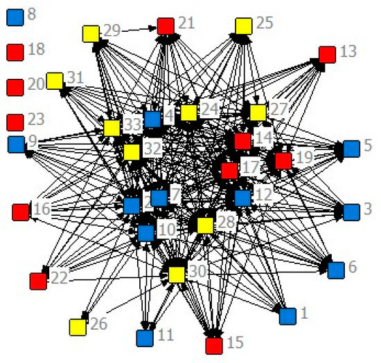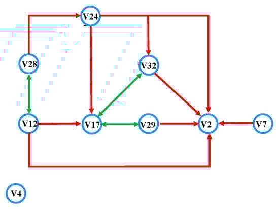 - Appropriate angle: the arrow pointing represents the direction of information flow, the starting end of the arrow is the cause, and the pointing end is the effect. V12 is the top of the information outflow point, which contains the most information. In addition to V12, the points V7, V17, and V28 are also at the front end of the information flow, indicating that these nodes also contain relatively more motion information. The information inflow points V2 and V29 are located at the bottom of the information flow. There are more information inflows, indicating that participation is of secondary importance when the angle is appropriate.