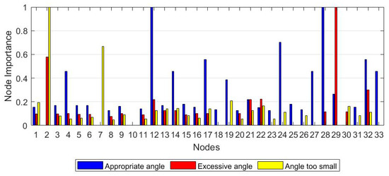 - Angle too small: V28 is located at the starting point of information flow and is relatively most important in the movement process. V28, V24, and V32 nodes contain more motion information when the angle is too small. V4 and V7 are at the end of the information flow chain when the angle is too small.