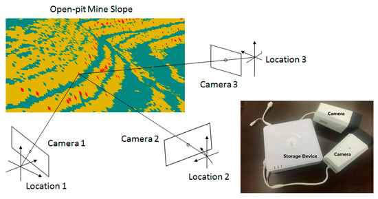 In consideration of the use of each monitoring method and the research results of the above-mentioned references, the characteristics of each monitoring method and its corresponding scope of application are summarized in Table 1. Among the methods applied for open-pit mine monitoring, the close-up photogrammetry technique is a moderate method which can provide high efficiency and inexpensive measurement, especially compared to the other usual methods of laser scanning, the Interferometric Synthetic Aperture Radar (InSAR), the Laser Radar (LiDAR), etc. [19,20,21]. The use of photogrammetry has the requirement of capturing images with a degree of overlap, which places demands on the deployment of cameras.