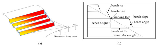 Schematic diagram of the monitoring object. (a) Schematic diagram of the monitoring of the open pit slope by cameras. (b) Section of the mine slope with the various parts of the open-pit mining.