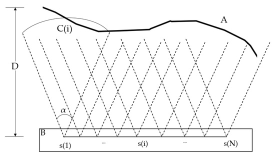 Geometric deployment of the camera sensor network, where curve A is the surface, B is the observation platform, s(i) is the camera sensor, the area corresponding to the two dashed lines is the shooting range C(i), α is the field of view, and D is the shooting distance.