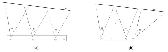 Camera sensor deployment in the X-direction: (a) the use of normal case photography and (b) the use of convergent photography to cover the entire mine surface. A represents the observed mine surface, the dotted line represents the photographic area, α represents the field of view, s(i) represents the camera monitoring point, and B represents the observation platform.