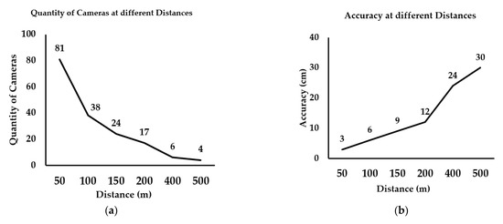 Quantity and accuracy of cameras at different distances. (a) The minimum quantity of cameras calculated for different distances. The further the distance, the fewer the cameras needed. (b) The distance each pixel represents in the field increases, which means that the accuracy decreases.
