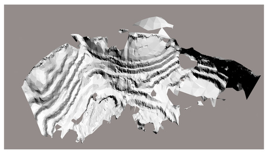 In the field, GPS sampling was used to locate camera points and set up the cameras. Multiple photos extracted from camera videos were prepared as the inputs. We used Smart3D software for the data preprocessing, aerial triangulation, dense matching of oblique images, DSM point cloud generation, triangulated irregular network (TIN) construction, texture mapping, model modification, and other processes, in order to produce a realistic 3D model, as Figure 12 and Figure 13 show.