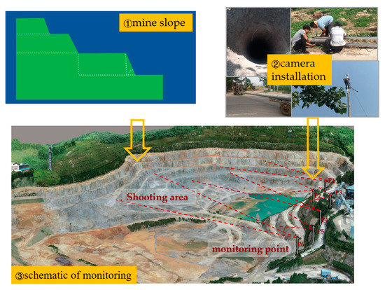 Schematic diagram of the camera field deployment. ① Schematic view of the slope of the mine. ② Pictures of the field installation, including pole tower transportation, drilling and camera installation, etc. ③ Schematic view of the Shunxing Quarry monitoring.