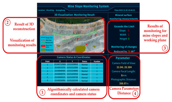 Figure 14 illustrates the open-pit mine slope monitoring system which we developed for the visualization of the results of the algorithm and the early warnings during the safety monitoring. This can be used to generate the field camera deployment solution, analyze the slope of the mine, and measure the width and height of the working bench to assess and construct warnings about mine slope damage risks. It also integrates 3D reconstruction, 3D monitoring, and 3D visualization of the mine slope.