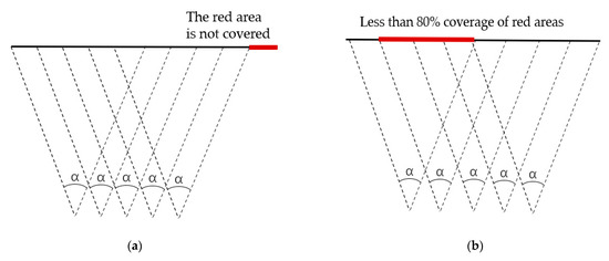 From a geometric point of view, for each sensor, its sensing area is defined by tuple , is the sensor’s position, D is the photography distance, is the sensing angle, and is the angle at which the camera deviates from the normal case photography direction. The aims are to ensure that the target surface is fully covered by the sensing area and that the image overlap rate between adjacent sensors is more than 80%. We can define the aims by the following three formulas: