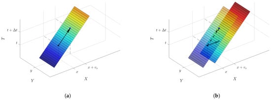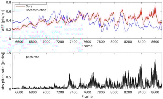 - Variance The method of maximizing a variance of the IWE [10]. In [10], the optical flow parameters were common in the patches, but in order to make the conditions uniform, a dense optical flow estimation was performed by adding the L1 smoothness regularization as follows:Events were warped by the optical flow at each pixel: . The loss function is optimized by the primal-dual algorithm in the same way as the TV-L1 method [31]. The duration of the events used was set to to match our method.