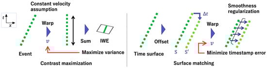 - Gallego, G.; Rebecq, H.; Scaramuzza, D. A Unifying Contrast Maximization Framework for Event Cameras, with Applications to Motion, Depth, and Optical Flow Estimation. In Proceedings of the IEEE Conference on Computer Vision and Pattern Recognition (CVPR), Salt Lake City, UT, USA, 18–22 June 2018; pp. 3867–3876. [Google Scholar] [CrossRef]