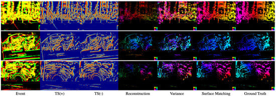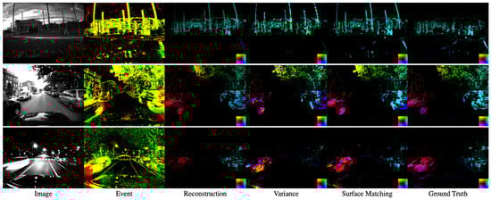 - Variance The variance loss represented by Equation (11). Events are warped by the optical flow which is common at all pixels. The duration of the events used and the time interval of the optical flow were set to and in order to match our method with the condition.