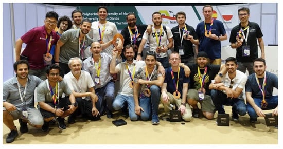 The experimental platform used to perform the experiments referred to in this paper was the off-the-shelf UAV, Parrot Rolling Spider, selected to streamline the possible reproduction of the obtained results by the readers. During the MBZIRC’s Grand Challenge a different, far larger, platform was used and the Skyeye team scored the third place in this challenge, see Figure 1. Skyeye was a multi-disciplinary and multi-national team, in which every group from the Universidad Politecnica Madrid (CVAR-UPM), Pablo de Olavide University (SRL-UPO), and Poznan University of Technology (AeroLab) provided its best capabilities and experience to conquer during the MBZIRC, combining their strengths with the team of Dr. Antonio Franchi, Laboratory for Analysis and Architecture of Systems (CNRS-LAAS).