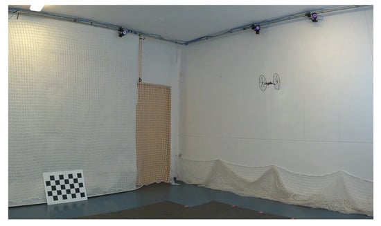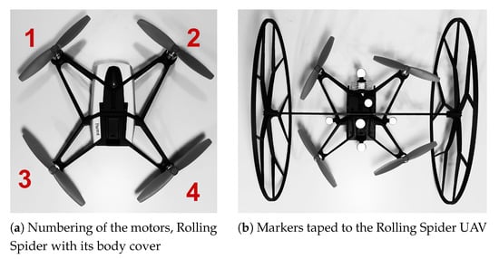 A proper visibility of the UAV was ensured by placing markers on its body. Small sizes, and light weight of the Rolling Spider drone cause severe problems at the configuration stage, combined in addition with a small thrust force generated by the propellers. To conduct the experiments, all necessary parts of the body of the drone were removed, to compensate for the weight of the markers. The markers themselves were placed on the UAV with no symmetry, but still below the propellers’ level, in order not to disturb the air flow, nor to alter the dynamic properties of the structure. The placement of the markers is shown in Figure 3b.