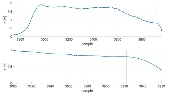 A proper calculation of the performance index for every flight required good synchronization between the data obtained from the OptiTrack and the reference signal fed to the Rolling Spider. As these two systems worked independently (and with different sampling frequencies), time stamp-based synchronization was impossible. The issue was solved by manual operation—after of every experiment, the script running the optimization procedure terminated the experiment, and switched the DC motors of the UAV off. The OptiTrack continued the registration of the data, what enabled one to identify the time instant when the free fall stage began, see Figure 4. After identifying this time instant manually, the OptiTrack-based data was cropped to the length of prior to the selected sample. Next, the reference signal values were calculated on the basis of analytical formulae (presented in the further part of the text) for every sample coming from the OptiTrack system.