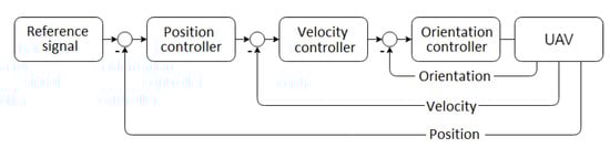 As it is known, every multirotor-based UAV enables three basic control regimes: position control, velocity control and orientation control. In typical systems, a cascade of controllers takes on the regulation tasks [33], as depicted in Figure 5. In the current work, position control was used, thus no problems with pitch or roll stabilization occurred, as the presented cascaded structure of the control system obviously refers to control actions in XY, whereas here we are mainly occupied with change in z axis.