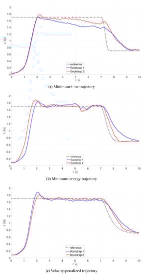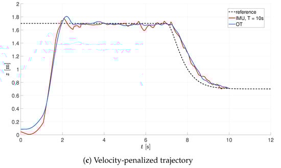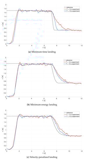 As during the landing process the altitude decreases, the reference trajectory leading to the ground level accepts no overshoots, independently on the landing scenario adopted. In this paper, three different scenarios are considered, namely: emergency landing (minimum-time landing), minimum-energy landing or velocity-penalized landing (planned landing). In all the scenarios, the reference trajectory changes the reference altitude , with as the initial altitude at , and being the ground level altitude.
