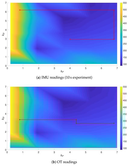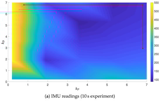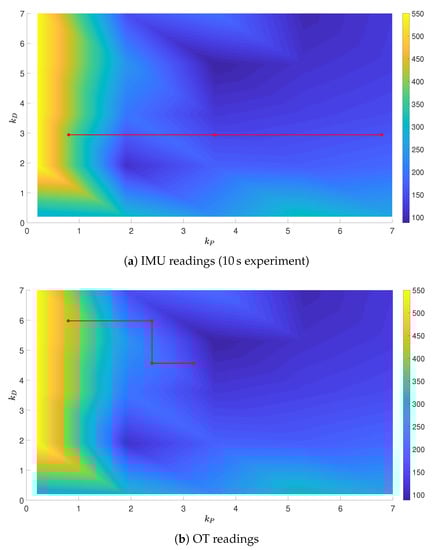 The Parrot Rolling Spider is equipped with the inertial measurement unit (IMU), allowing one to obtain estimates of the position and orientation of the drone in a 3D space. One of the core assumptions when conducting real-world experiments is the duration of the experiment. On the basis of several trials ( and long), composed of ‘take off’, ‘hover’ and ‘land’ stages (the latter executed at ), it was fixed that the IMU-based measurements were biased by errors incrementing over time, thus it was welcomed to reduce the duration of experiments to evaluate the performance in a more accurate way. It was found advantageous to use a MoCap system instead of the IMU to get the correct readings to calculate performance-related indices, to perform tuning.