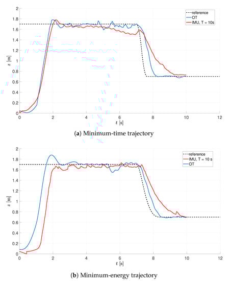 Based on the derivations given in [5], and dynamic optimization [31], the minimum-time landing scenario is composed of two stages. In the first stage, the thrust is zeroed admitting to a maximum altitude decrease rate. In the second stage, a full thrust is used to mimic the braking stage. The landing thus undergoes the reference altitude change in stage-by-stage fashion, switched between at time instant and the UAV lands at where ( is the maximum torque, resulting from control signal cut-off level):