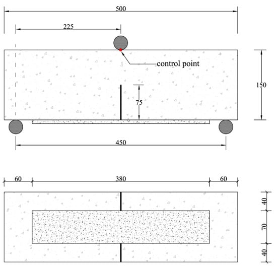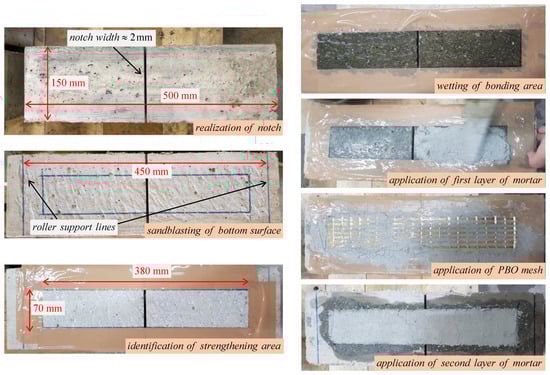 Prismatic concrete beams with nominal dimensions 150 × 150 × 500 mm are casted in preformed formworks, demolded after 24 h, and wrapped with a wet cloth to prevent water evaporation during the next 28 days, as shown in Figure 2. After 28 days, a band saw is employed to realize a notch starting from the mid-span of the specimen, with width equal to 2 mm and depth equal to 75 mm, in accordance with ASTM D7958/D7958M standards []. Then, the bottom surface is sandblasted and the strengthening area where to apply the FRCM sheet is identified. The application of the externally bonded PBO-FRCM sheet implies the following steps: (i) wetting of the strengthening area; (ii) application of the first layer of mortar (thickness 4 mm); (iii) application of the PBO mesh; (iv) application of the second layer of mortar (thickness 4 mm). The preparation phases of the notch realization and subsequent application of the externally bonded PBO-FRCM sheet on the bottom surface of the concrete beams are illustrated in Figure 3. The final concrete beam configuration with the externally bonded PBO-FRCM sheet for the three-point bending tests in accordance with ASTM D7958/D7958M standards [] is reported in Figure 4.