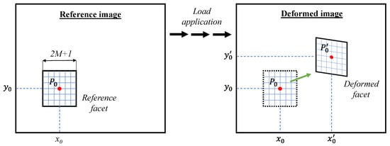 The fundamentals of the DIC measurement process [] are illustrated in Figure 5. The reference image represents the initial condition of the specimen, which generally coincides with the unloaded configuration. This image is divided into subsets, termed facets, identified by an area of (2M + 1) × (2M + 1) pixels, where M is a positive integer number and other than 0. The subset size is critical to DIC accuracy, so it should be properly selected according to the actual random intensity distributions of the speckle patterns []. As the specimen is loaded, the facets are subjected to displacement and strain. Hence, the generic point P(x0; y0), centered in a reference facet, moves to the new position P’0(x’0; y’0) within the deformed facet. This displacement and the consequent strain are estimated using a cross-correlation (CC) or sum-squared difference (SSD) correlation algorithm, which identifies the similarity between the reference and the deformed facet. From a mathematical point of view, this involves searching for the peak of the distribution of the correlation coefficients. Specifically, the location of the target subset is identified, once the maximum or the minimum correlation coefficient has been found, depending on the used correlation criterion. Instead, the strain field can be obtained by numerical differentiation.