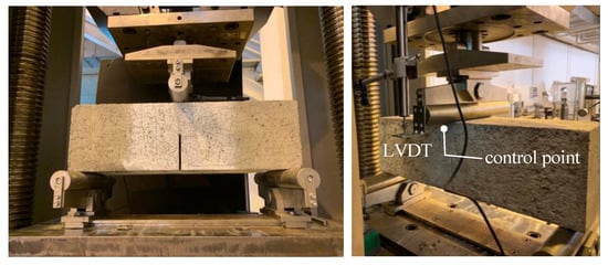 Three-point bending tests are performed according to ASTM D7958/D7958M standards [], using a Zwick universal testing equipment with load capacity equal to 600 kN. The tests are conducted in displacement-controlled mode, with a constant displacement rate set as 0.05 mm/min. The displacement is monitored at a control point located at the top of the beam under the roller used for the load application, using a linear variable displacement transducer (LVDT) as illustrated in Figure 6. The load is monitored using a load cell integrated in the testing equipment. The tests are carried out until complete failure of the specimen, which is identified by a reduction of the load measured by the cell equal to 80%.