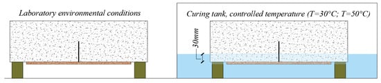 The tests comprise different environmental conditioning of the specimens. After the application of the externally bonded PBO-FRCM sheet, three curing conditions are considered (see Figure 7):