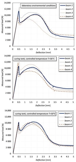 Results of the tests in terms of load-deflection curves for different curing conditions.