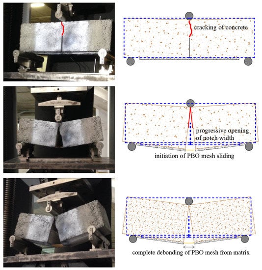 For all the beams, the complete failure is related to the PBO mesh debonding from the mortar matrix. As shown in Figure 10, the mortar matrix remains attached to the concrete substrate due to the good compatibility between the two cementitious materials. Upon progressive cracking of concrete region above the notch, an increase in the opening of the notch width is observed, until the beam is eventually split into two halves. The vertical deflection of the beam produces a rotation of the two halves of the beam with respect to the loading point under the roller support. In this condition, the load is entirely transferred to the FRCM fibers that, to accommodate the further increase of vertical deflection of the beam during the test, must detach progressively from the mortar matrix. Hence, a rigid body motion occurs up to complete PBO fiber sliding from the mortar matrix, cf. again Figure 10.