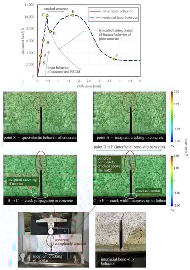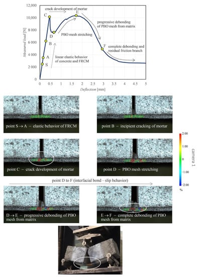In the initial beam behavior, the beam contribution and the FRCM contribution are mutually interacting. Once the concrete cracking and mortar cracking occur, the FRCM contribution prevails. In the interfacial bond behavior, the concrete is completely cracked, as shown in the DIC images. The load level C corresponds to the attainment of the mortar cracking. Once the critical deflection of point C (around 0.5 mm) is exceeded, a clear softening branch is observed from point C to point D, which is related to the residual tensile stress of concrete observed in the range of narrow crack widths [,]. This softening branch is similar to the behavior observed in fracture mechanics by testing a plain concrete prismatic beam specimen. In contrast to the case of a plain concrete specimen, in this case the beam is strengthened by the externally bonded FRCM sheet. Consequently, from point D the FRCM interacting contribution is involved since the PBO mesh stretches and, consequently, starts sliding from the mortar matrix, and a gradual increase of the load-carrying capacity is observed in the load-deflection curve. From point D the DIC images reveal that the sliding of the PBO grid from the mortar matrix becomes more manifest. The load first increases up to point E and then decreases from E to F. At point F, the load-deflection curve terminates with a typical horizontal friction branch, related to the residual strength at the FRCM-concrete interface [].