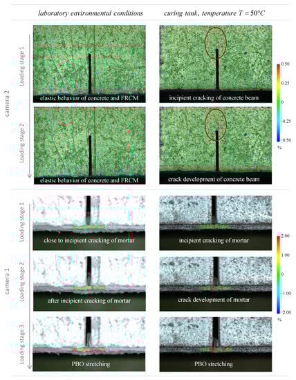 It is worth noting that the characterization of the bond behavior at the FRCM-concrete interface is assisted by the DIC images, which allow a clearer interpretation of the mechanical behavior of the notched concrete beam, especially in the precracking phase. More specifically, the DIC-processed images explain the interaction of the two parallel resisting contributions in the specimens and the stress transfer mechanism with the increase of the vertical deflection of the beam. By inspection of the images related to the camera 1, it can be seen that the DIC strain maps are very useful to anticipate the incipient crack initiation of both concrete and mortar matrix under service conditions and the subsequent initiation and development of PBO mesh sliding from mortar matrix. To clarify this aspect and to investigate the effect of the different curing conditions of the samples, some DIC images aimed at capturing the occurrence of incipient crack and crack development are reported in Figure 13. Two representative specimens are compared, one cured at laboratory environmental conditions and one cured in tank at controlled temperature of 50 °C. Some loading stages (two for the concrete area above the notch and three for the FRCM-concrete interface, at equal loading level for the two curing conditions) are analyzed and compared. The images related to the camera 1 and 2 are reported at two different scales because the deformations corresponding to crack initiation are different in concrete and FRCM mortar. However, the same scale is adopted for the two curing conditions for comparison purposes. It is clearly seen that the curing condition slightly affects the mechanical behavior of the specimen in the cracking phase, something that is impossible to capture by the observation of the mere load-deflection curves. More specifically, for the specimens cured in tank at controlled temperature the concrete above the notch exhibits an incipient cracking at lower load levels compared to the specimens cured in laboratory environmental conditions. This seems to indicate that the temperature condition applied to the bottom part of the specimen has slightly altered the stress transfer mechanism at the FRCM-concrete interface, and, in turn, has generated a premature cracking of the concrete above the notch. On the contrary, after cracking of mortar takes place, the elongation of the PBO mesh increases until subsequent debonding from the mortar matrix, and this phenomenon is almost comparable in the two curing conditions, which is also confirmed by the qualitative agreement of the load-deflection curves observed for the two classes of specimens (see again Figure 9). Therefore, the macroscopic bond behavior is not significantly affected by the environmental conditioning.