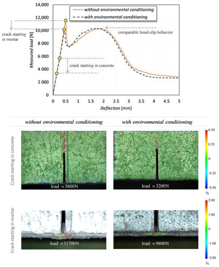 Finally, Figure 14 focuses on the crack starting in concrete and in FRCM mortar. The load-deflection curves of the two analyzed specimens are shown in the top part of the figure, and the load levels corresponding to the crack starting of the two resisting elements (concrete and mortar) are also identified in the plot for the two curing conditions. Not only the concrete cracking but also the mortar cracking occurs at a lower load level in the specimen cured in tank at controlled temperature of 50 °C compared to the specimen cured in air at laboratory environmental conditions (i.e., without environmental conditioning). The crack load in concrete is almost halved in the specimen with environmental conditioning compared to the specimen without environmental conditioning, whereas the reduction of the crack load in mortar is less pronounced. The load-deflection curves exhibit an almost identical (qualitative and quantitative) behavior in the branches following the mortar cracking and representing the actual bond behavior at the FRCM-concrete interface (with the PBO mesh sliding from the underlying mortar matrix). This confirms that the curing conditions, in particular the effect of temperature and relatively humidity applied to the specimen, have a marginal influence on the interfacial properties of FRCM composite systems applied to concrete substrates, at least for the relatively short duration of the thermal treatment and temperature range involved in this experimental campaign.