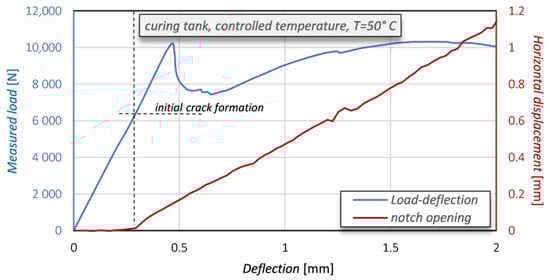 Figure 15 shows the opening of the notch in comparison with the load-deflection curve. The measurement of the notch opening has been obtained by monitoring the horizontal displacement of two points located on opposite faces of the notch, 1 cm below its upper boundary (notch tip).