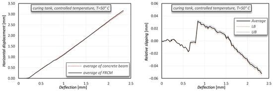Any slippage of the concrete beam with respect to the FRCM would highlight a limited adhesion capacity of the mortar matrix to the concrete substrate. Figure 16 (left) reports the average horizontal displacements measured on 10 corresponding points belonging to the concrete beam and to the FRCM, respectively, while Figure 16 (right) displays their difference (which can be meant as a “relative slipping”) together with upper and lower bounds (i.e., ± standard deviation). The maximum shift is below ±0.05 mm, thus proving that no practical relative slipping occurs between the beam and the reinforcement.