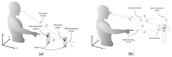 The authors of this paper assume that a target point-of-intention (POI) is allocated anywhere in a 3D space and aims to develop a practical intention estimation system while using a multimodal fusion of hand pointing and eye gaze. According to a study of psychologists that human eyes usually saccade within approximately 5–10 degrees for finding a fixation on an object [17,18], our paper mainly contributes to propose a multimodal fusion between hand pointing and eye gaze for 3D POI detection. In practice, the intention has to be determined first, and then the intended point would be estimated. In order to determine the intention, the hand pointing vector, which is the most important gesture to express intention is ideally assumed to cross with the eye gaze vector at an intended point in a 3D space. In reality, some errors may occur due to human eye saccades, and it is hard to find the crossing point. Therefore, this paper sets a space of interest (SOI) representing the vector of eye gaze based on the psychologist knowledge to find a crossing point with the hand pointing vector for intention determination, and contributes multimodal fusion method of hand pointing and eye gaze. Moreover, a hand that is freely moved needs to be determined as hand pointing when users intend to point to a 3D intended point. This paper also proposes a method of hand pointing determination while using projected 2D templates of hand pointing and straight index finger detection.