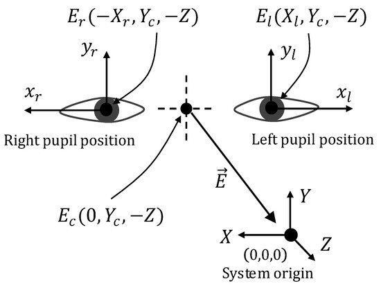 When a human watches a 3D POI (D), as shown in Figure 1, a vector of eye gaze () is theoretically drawn from the center () of both the left and right pupils to the POI (D). The eye tracker [30] that was used in this paper normally provides the positions of the left and right pupils. These positions are then used in order to calculate the center () of both pupils, and a 2D POG (A), which is a eye gaze point on the virtual board, is used with the mentioned center point () to create the vector of the eye gaze (). In this paper, the system origin is initially established at the center of the eye tracker, and the positions of the extracted left and right pupils are located at the coordinates and , respectively, as shown in Figure 3.