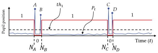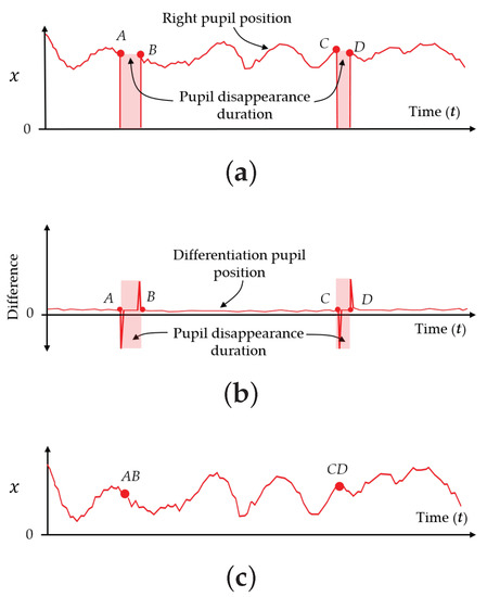 Humans normally blink their eyes [42] and cause the eye tracker to sometimes lose track of the pupil positions, as seen in the observation results of the left and right eyes over time. The duration of this tracking loss is called the pupil disappearance duration in this paper. In addition to the constant saccades of human eyes, it is found that the pupil positions sometimes disappear in the data series of pupil positions in the time domain. Therefore, the saccades and blinks of the human eye cause vibrations and outstanding peaks, respectively, as shown in Figure 4a. W. Pichitwong and K. Chamnongthai [33] take the average to determine the representative position of the pupil and, therefore, errors occur due to pupil disappearance. If we take derivatives between consecutive time frames, the differentiation results detect peaks that represent the starting and ending points of a blink or pupil disappearance duration, as shown by ( and ) duration in Figure 4b. These pupil disappearance durations are detected and ignored in the method proposed in this paper, and the original signal representing the pupil position becomes an analog signal including only the vibration of saccades, as shown in Figure 4c. Therefore, the average position of the signal is improved as compared with that in the conventional method [33].