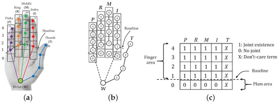Definition of hand and template: (a) Finger joints and skeleton, (b) Template, and (c) Matrix.