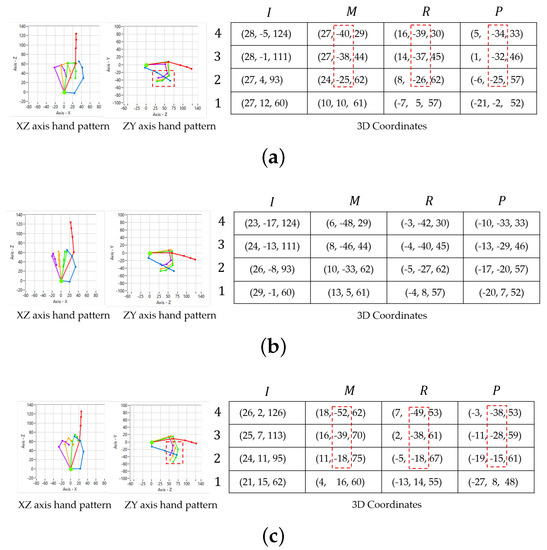 In the viewpoint of the Leap Motion sensor that is installed below the hand, finger joints are sometimes considered to be occluded in the palm or other fingers. This is likely to cause errors in finger joint extraction. The view angle of the hand should be facing the sensor at the appropriate angle to obtain the finger joint positions and convert them to a template. Therefore, it is required to rotate [47] the hand (X, Y, Z) at the wrist to the desired angle with the following equation: