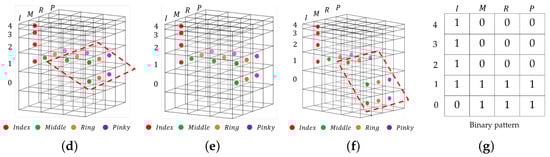 Comparison of a hand pointing pattern in different postures: (a) Hand pointing in origin posture with coordinates, (b) Hand pointing in rotated posture, (c) Hand pointing with slight changes, ring, and pinky finger, (d) 3D binary pattern of (a), (e) 3D binary pattern of (b), (f) 3D binary pattern of (c), and (g) Two-dimensional (2D) binary patterns of (a,c)